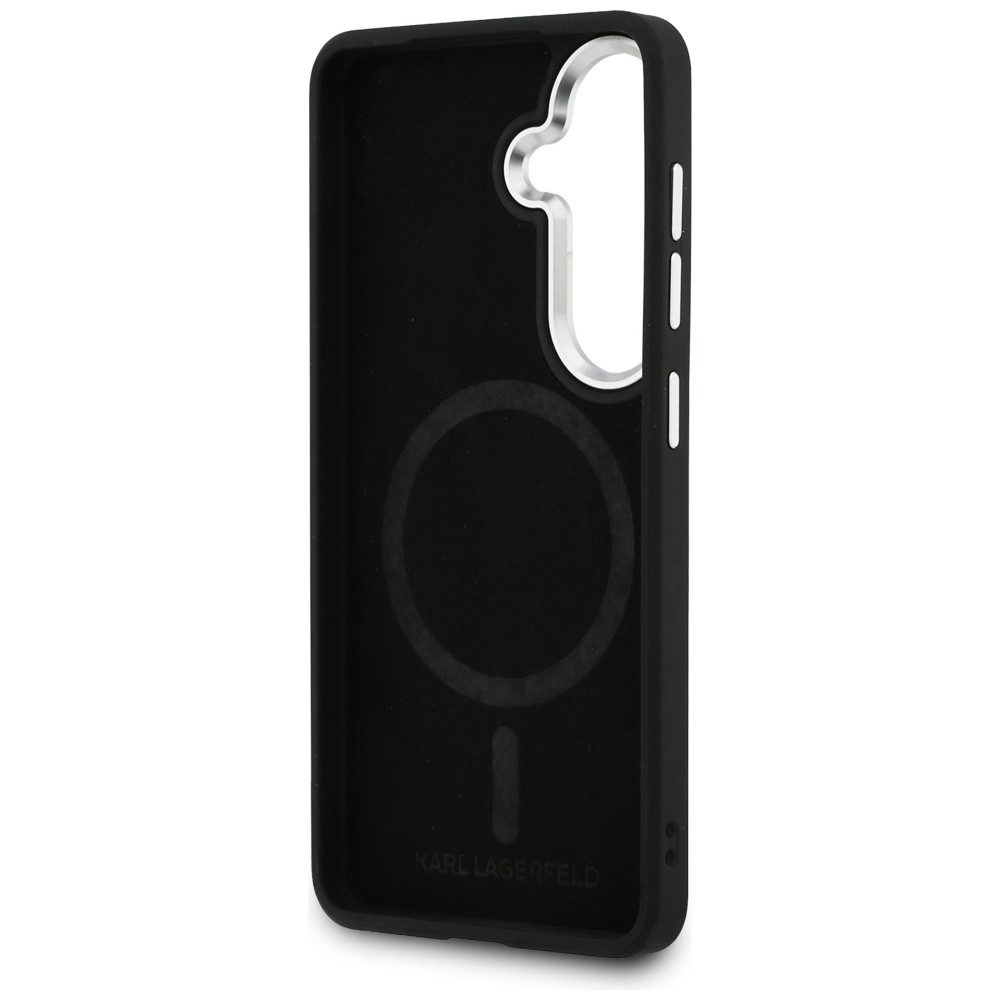 Hrbtna stran je okrašena z **reliefnim monogramom KL**, na dnu pa je subtilen **srebrn logotip Karl Lagerfeld**.